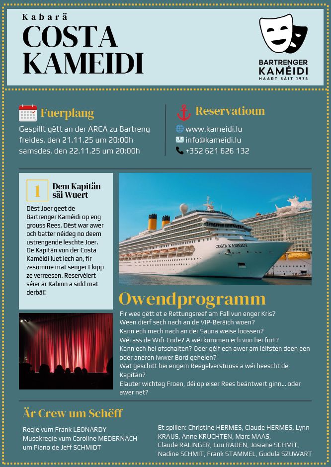 De Kapitän vun der Costa Kaméidi luet iech an, fir zesumme mat senger Ekipp ze verreesen.